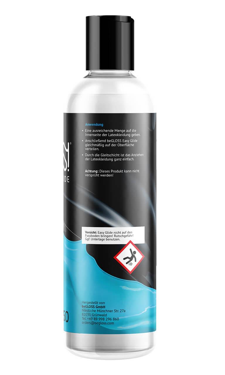 beGLOSS EASY GLIDE erleichtert das Anziehen von Gummi - und Latexkleidung. Eine ideale Anzieh-Unterstützung verleiht hervorragende Gleiteigenschaften und ein besonders angenehmes Tragegefühl auf der Haut.