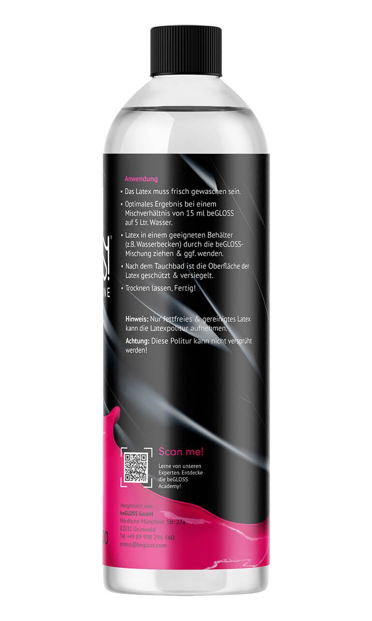 beGLOSS PERFECT SHINE - Perfect Shine & Sensitive Care - Optimaler und professioneller Hochglanz - Latexlook und schonende Pflege. Das Silicon Latex ÖL, die Hochglanz Pflege Politur, verleiht Gummi & Latex Kleidung einen hochglänzenden Latex Look. Die perfekte Hochglanz Veredelung für Gummi & Latex Kleidung.