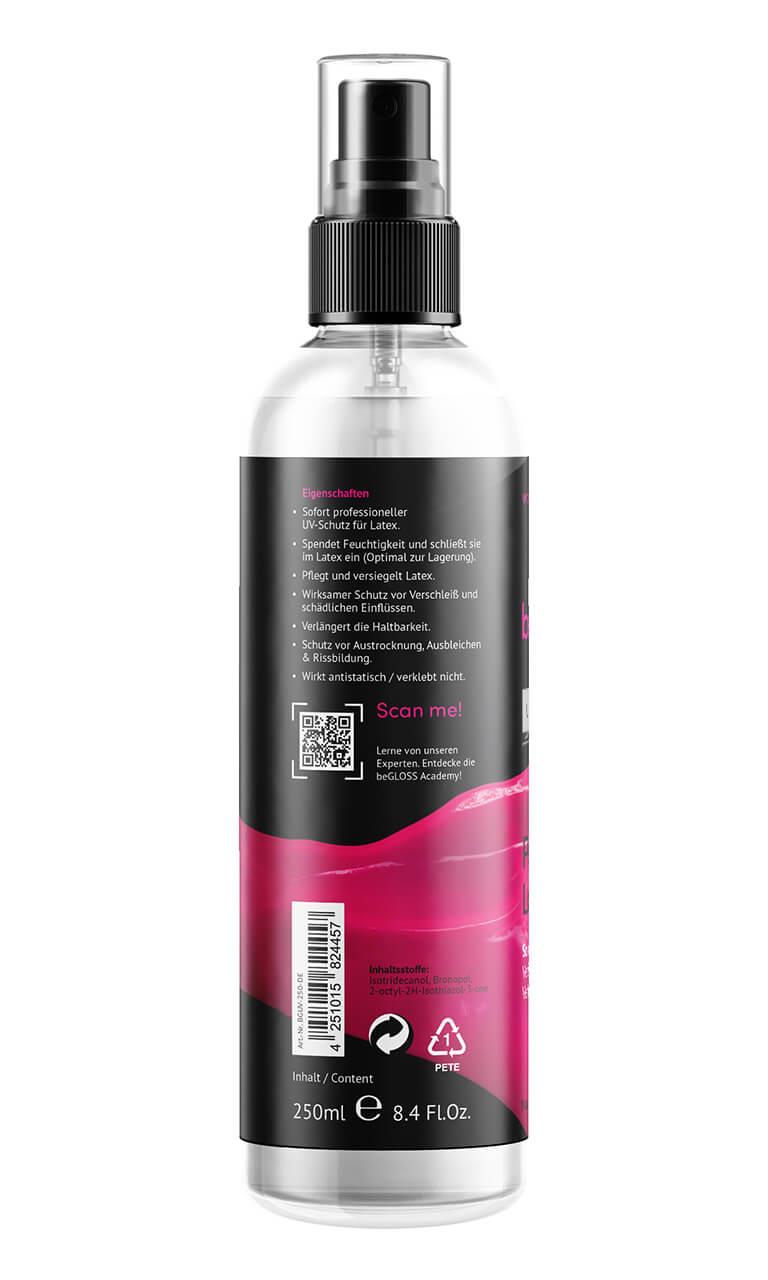 Ist das Latex komplett trocken, besprühen Sie ihre Latexbekleidung mit beGLOSS Perfect SHINE UV & STORAGE PROTECTION.